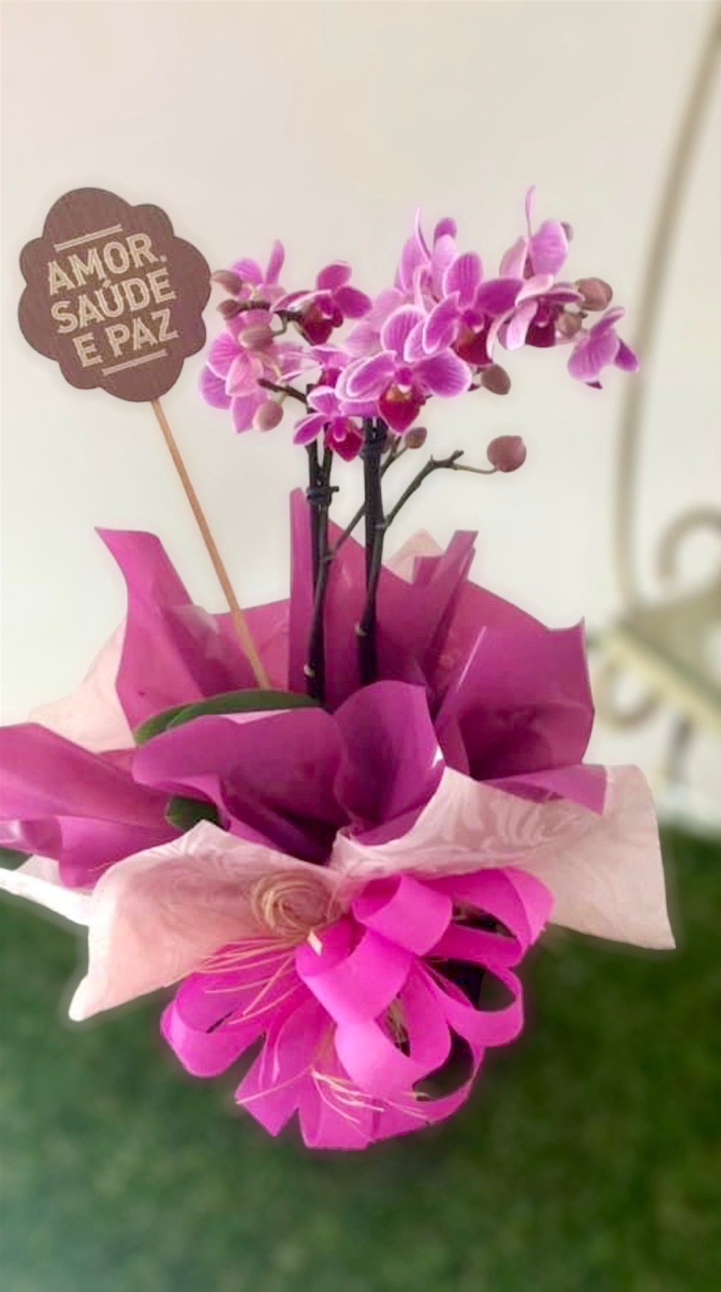 Delicada mini orquídea phalaenopsis em tom rosa vibrante, com haste dupla e botões em formação. Acompanha uma charmosa embalagem em papel rosa e lilás, com laço decorativo e plaquinha de madeira com a mensagem “Amor, Saúde e Paz”. Ideal para presentear com carinho e significado.