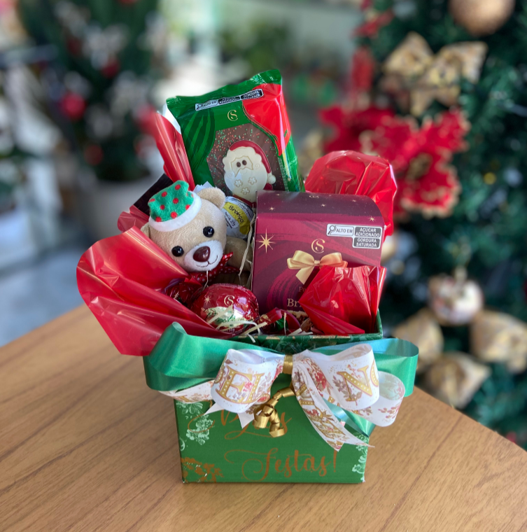 Contém: Chaveiro de Pelucia, Panettone 130g, Tablete de Chocolate e Bombons Cacau Show.