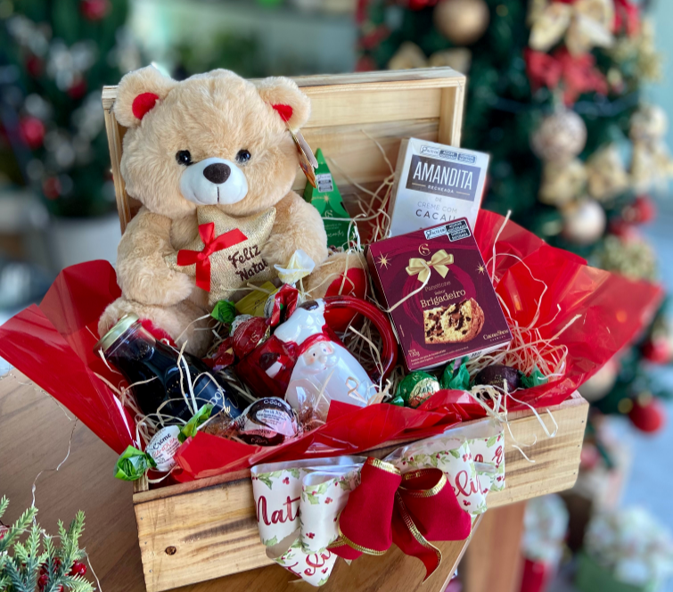 Contém; Pelucia, Xícara, Amandita, Panettone 130g Cacau Show, Suco de Uva, Drageados de Chocolate e Bombons Cacau Show.