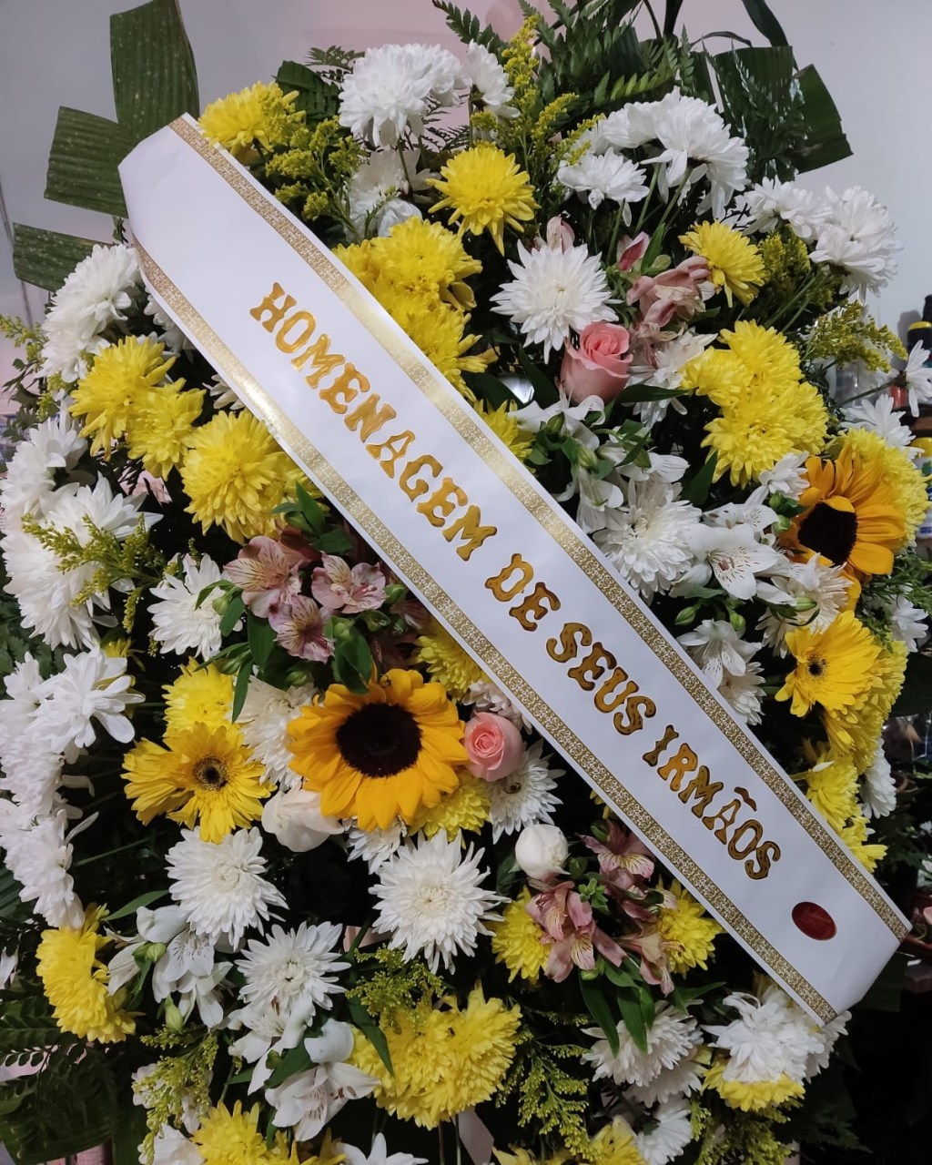 Esta coroa fúnebre é composta por uma combinação harmoniosa de flores amarelas, brancas e toques suaves de rosa. Entre as espécies estão girassóis, crisântemos, margaridas, astromélias e rosas. A faixa branca com detalhes dourados traz uma mensagem, demonstrando carinho e respeito dos familiares à pessoa homenageada. A coroa é volumosa e bem estruturada, ideal para cerimônias de despedida com elegância e sensibilidade.